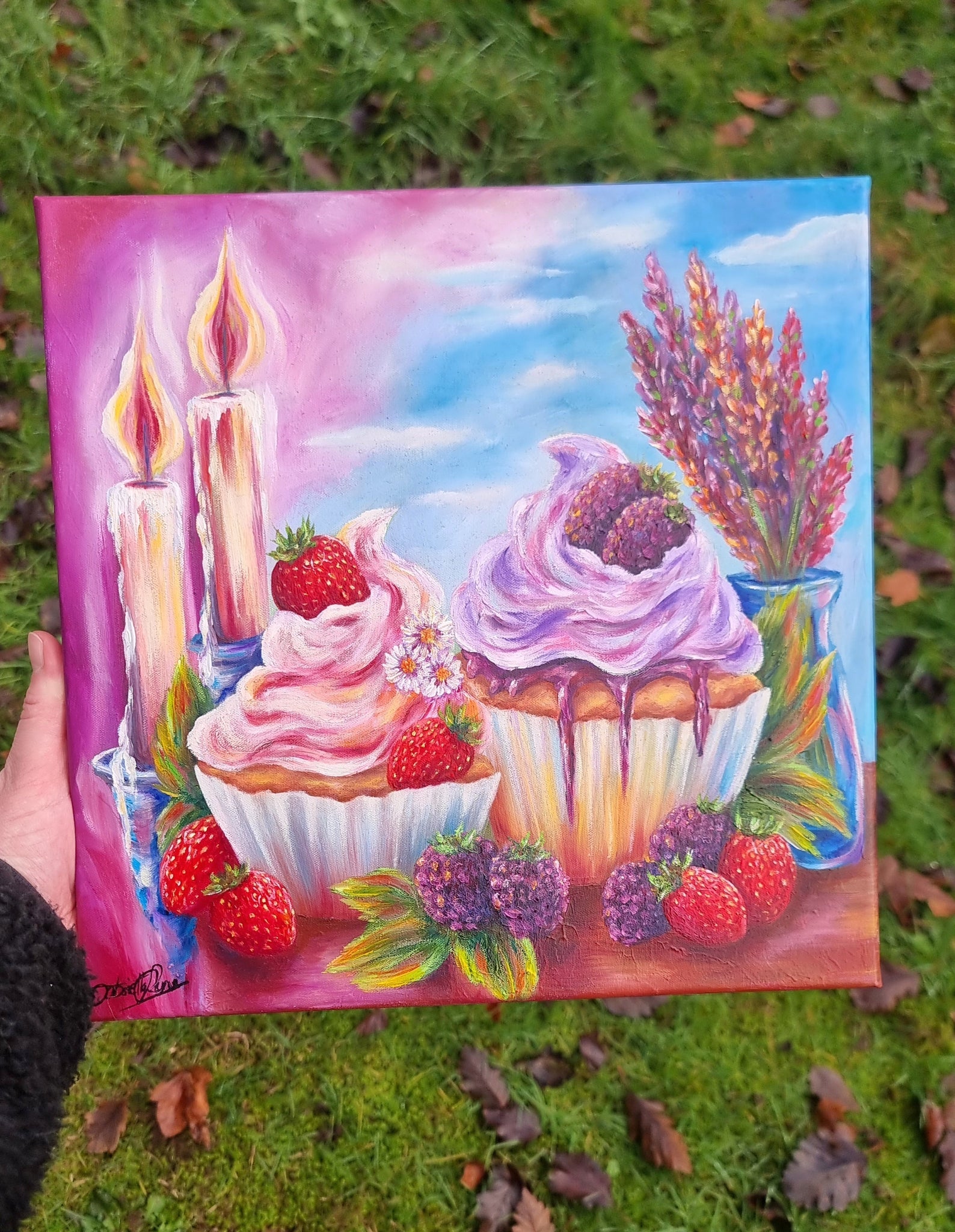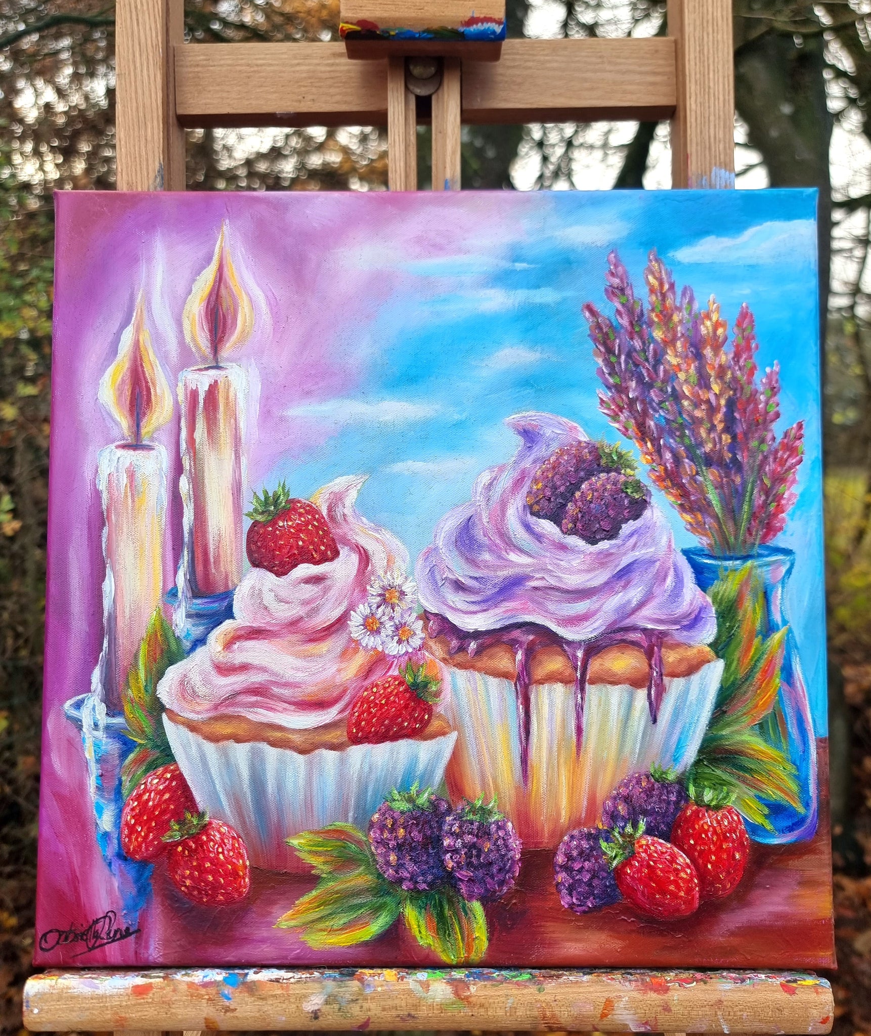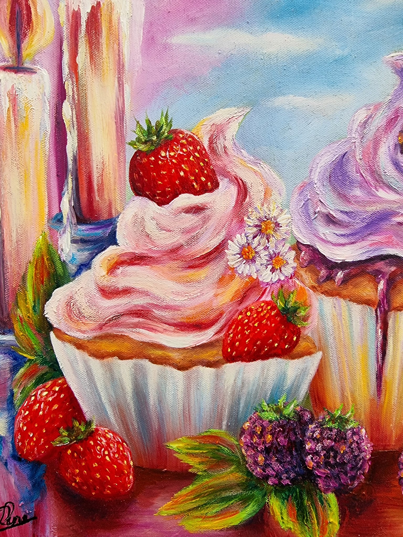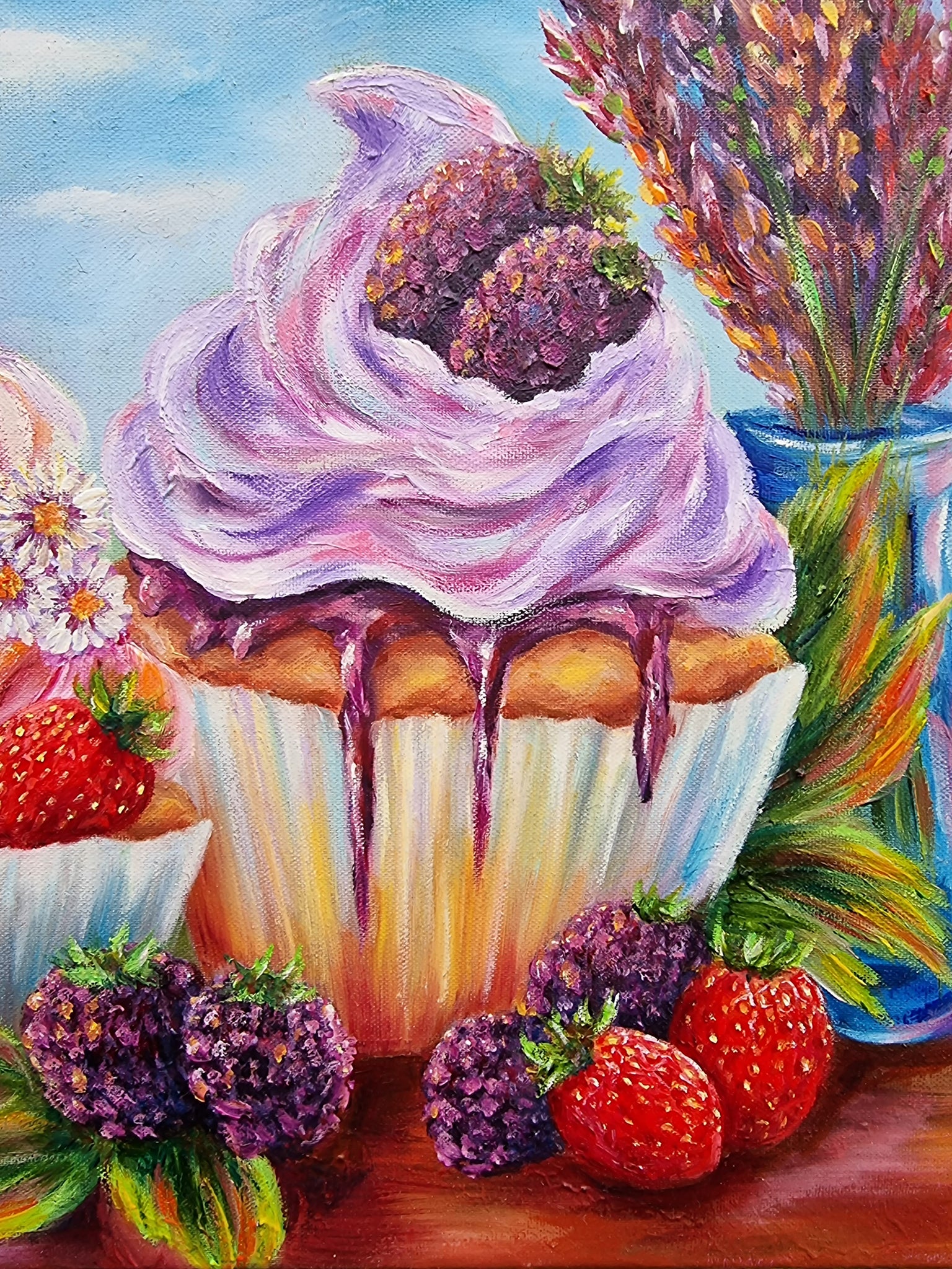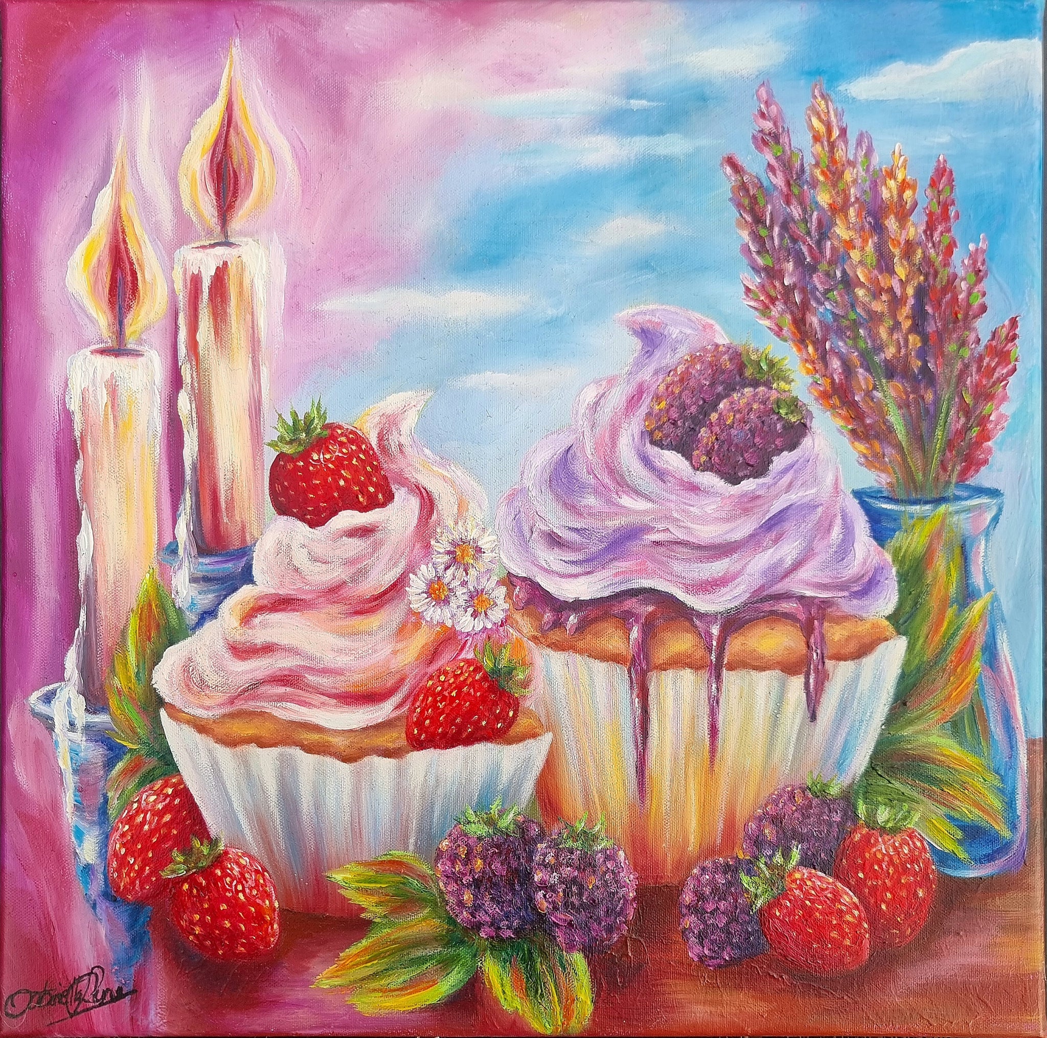 Et lyst og livsglad motiv, hvor cupcakes, blomster og jordbær stråler under en blå himmel. Et billede af sommerens smag, friskhed og de små glæders skønhed.